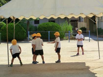 運動場にテントを設置、藤棚にはミストを行い、運動場で遊ぶときは帽子をかぶって遊ぶ。教室にもどれば、お茶を必ず飲みます。