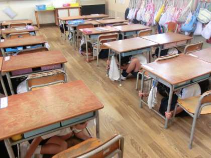 先生の指示に従って、机の下にもぐりました。訓練をしました。