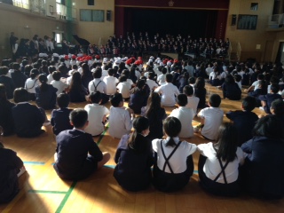 8日の住吉区交歓音楽会に出場する5年生が、交流会で発表する合唱、合奏をぐんぐんタイムに披露しました。児童会が司会、進行しみんなで応援しました。