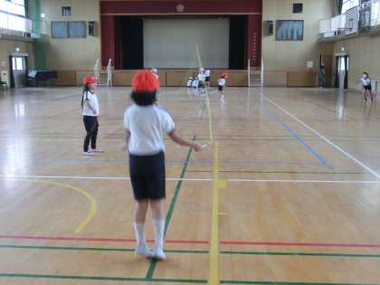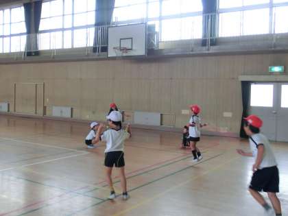 講堂では、なわとびをしたり、走り回ったりして、寒さに負けない