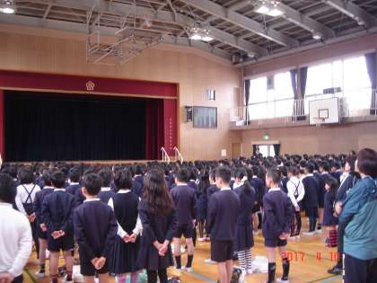 本日始業式が行われました。満開に咲いた桜の下、子どもたちが元気に登校してきました。講堂では、校長先生の話、生活指導部の先生の話がありました。子どもたちは、背筋を伸ばしてしっかり相手の方を向き、集中して話を聞くことができていました。素晴らしいです。校歌を歌う子どもたちの声がとてもきれいに響き渡り、会場が暖かい空気に包まれました。