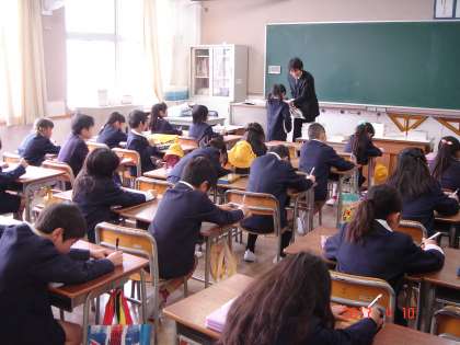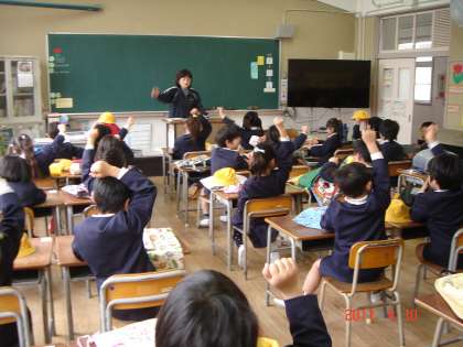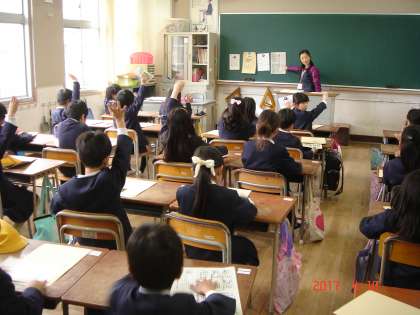 2年生の教室の風景です。これから使うテープに自分の名前を書いたり、配られたプリントを確認したり、グーの合図で静かに集中したりしています。