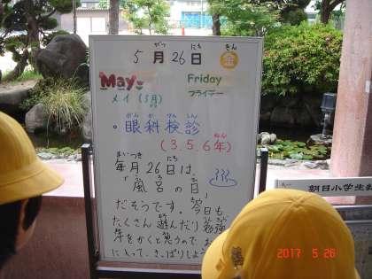 朝、子どもたちが玄関を入ると、池の前あたりにホワイトボードの掲示板が出されています。当日の行事とちょっとしたコメントが書かれています。子どもたちは楽しみにしているようです。