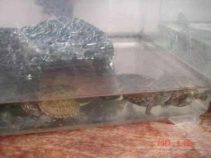学校の池の周りで、子ガメが見つかりました。ビオトープにいるカメの子どもでしょうか?