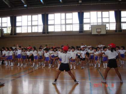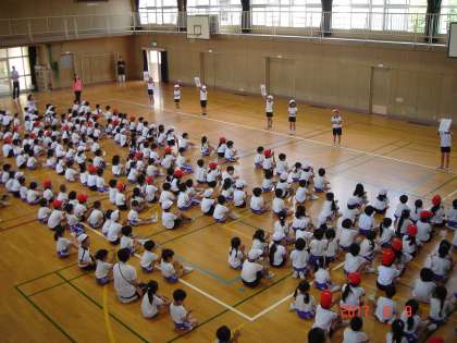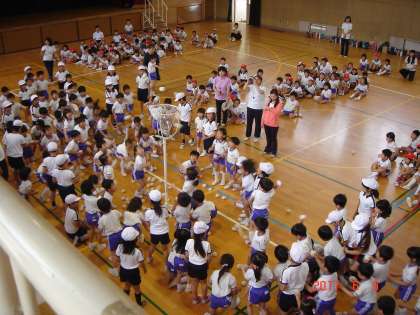 約180名のよさみ幼稚園の子どたちに来ていただき、講堂で、「ジャギー体操」をしたり、「ビンゴ」の歌を歌ったり、玉入れをしたりしました。仲良く、楽しく活動することができました。