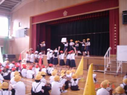 今日の児童集会は、英語でジャンケンゲームでした。後出しジャンケンで、勝ったり、負けたり、あいこだったりするようにジャンケンをしました。