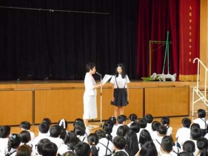 1学期終業式が講堂で行われました。校長先生より1学期よく頑張ったという反省の話と、32年前の日航機墜落の命のお話がありました。社会を明るくする運動の標語コンクールで受賞した6年生への賞状授与もありました。