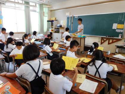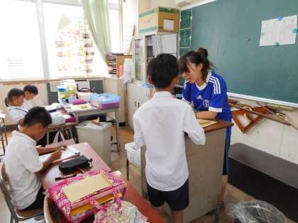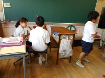 教室では、担任の先生から通知票や健康の記録をいただきました。「ここはがんばったね。2学期はこんなところをがんばろうね。」一人ひとり丁寧に渡してもらっていました。