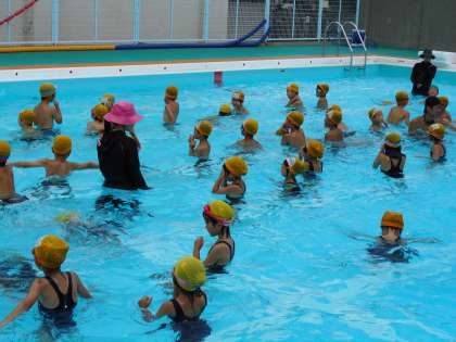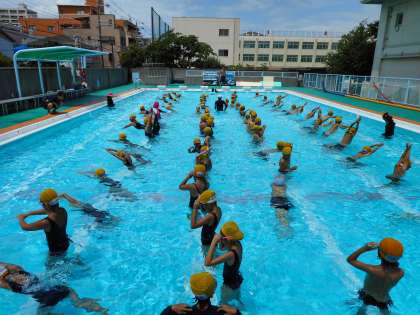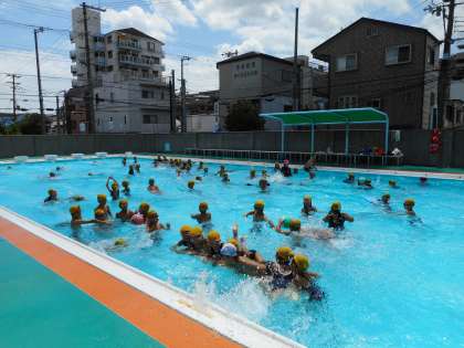 3・4年生の子どもたちが、賑やかにプール開放を楽しんでいます。水慣れや泳ぎ方の復習をした後は、お楽しみの自由時間です。