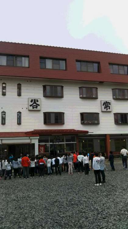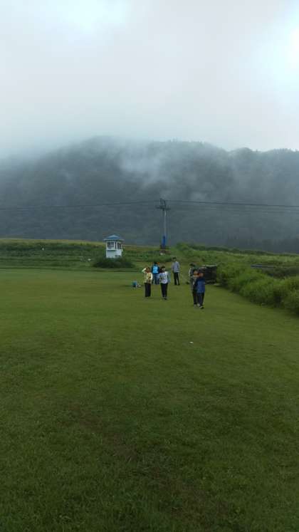 林間学習2日目、朝の集い。みんな元気に集合。キャンプファイアの後片付けをする子どもたちの後方、鉢伏山の頂上は、まだ霧につつまれています。