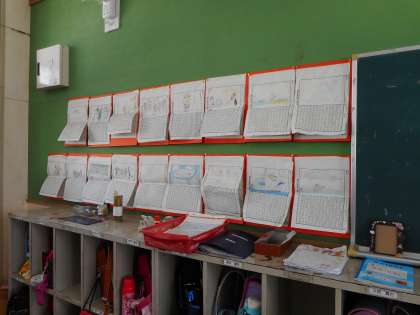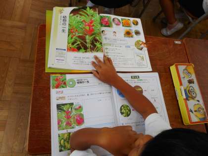 3年生では、理科の時間、ホウセンカやマリーゴールドなどの観察をしながら「植物の一生」を学習しています。背面の掲示板には、夏休みの絵日記が貼られています。楽しい夏休みだったようです。