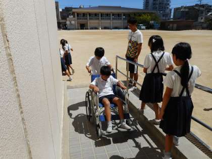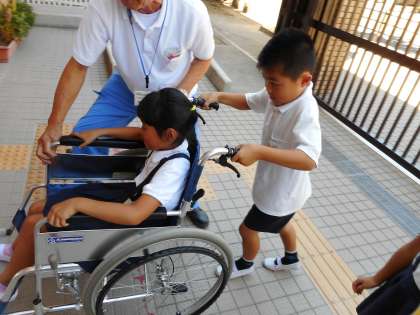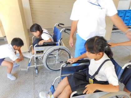 今度は、学校内で介助コースを体験します。3〜4人グループで、交代しながら介助しました。各ポイントに先生たちやリハビリテーションセンターの方々がついてくれるので、安心して回ることができましたが、自転車がじゃまになったり、案外段差が多く大変でした。全員がしっかり体験できるように、細かいところにも気を配り、準備していただいたリハビリテーションセンターの方々に感謝いたします。