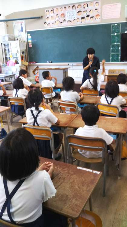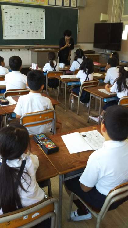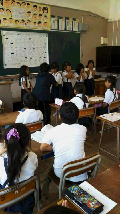2年生では、道徳の学習で、手話の体験をしています。耳が聞こえない方の気持ちを考えました。