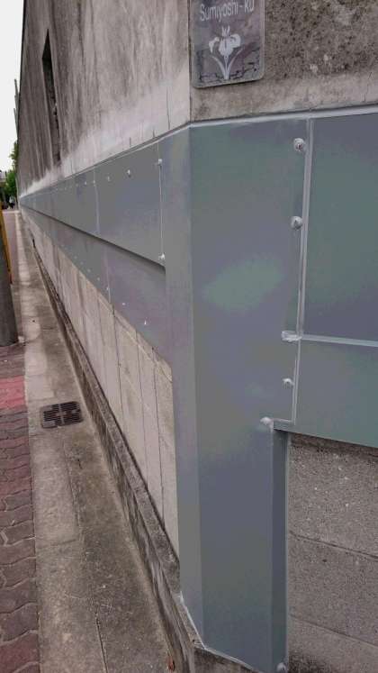 プールの外壁が、基礎の鉄材が錆びたり、その下部のブロックが崩れたりしていました。子どもたちの通学路で地域の生活道路の歩道にも面しているため安全に通行できるように改修工事をしました。鋼材が張られたり、コーキングされたり 綺麗になりました。