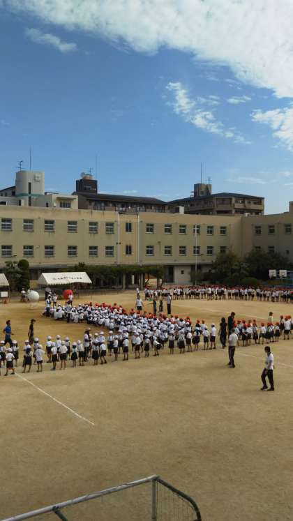 児童集会で「みんなで大玉よいしょ」の練習をしました。