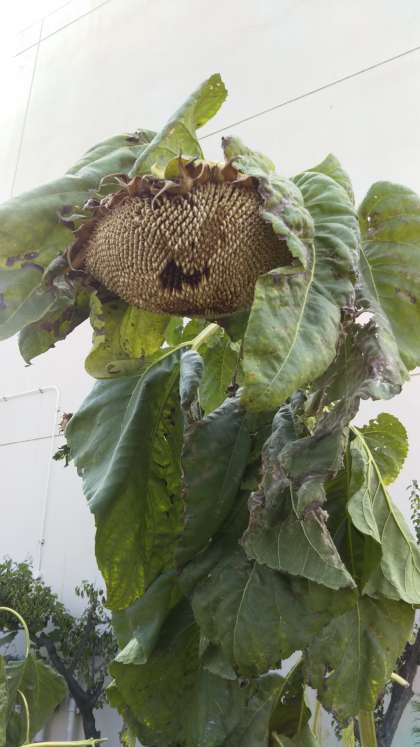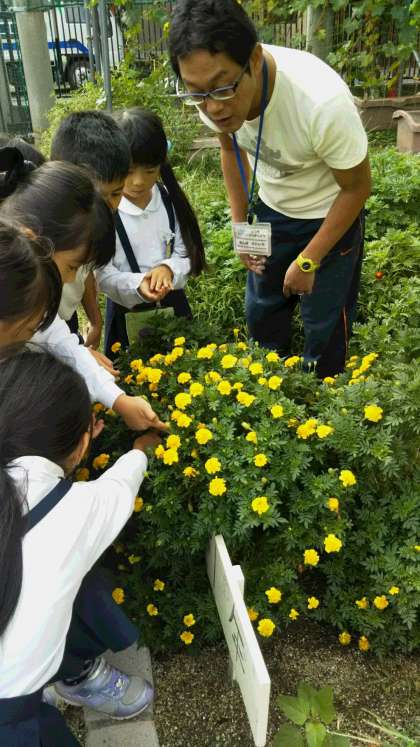 「きれいにさいてね」の学習で、学習園のマリーゴールドの種をとっています。ひまわりにもたくさん種ができました。