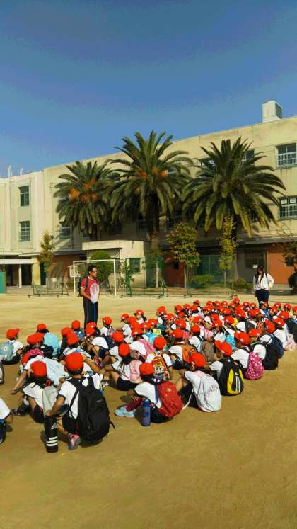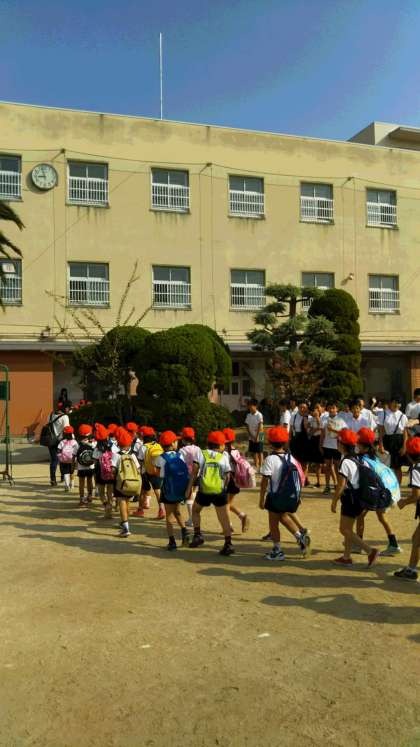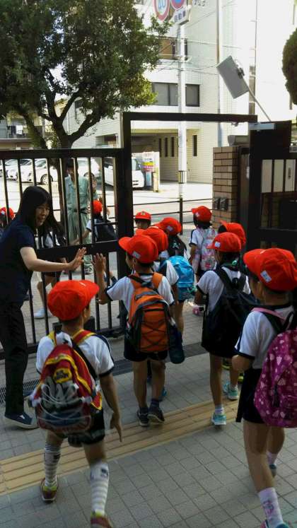 晴天の遠足日より。行ってきますの元気なあいさつをして、出発。