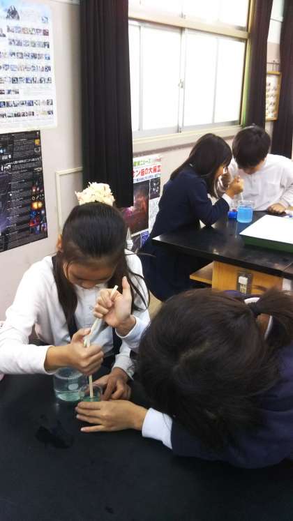 科学クラブでは、「水中シャボン玉」を作りました。絵の具で色付けしたシャボン液をストローで水の中に上手く落とすときれいな玉ができます。