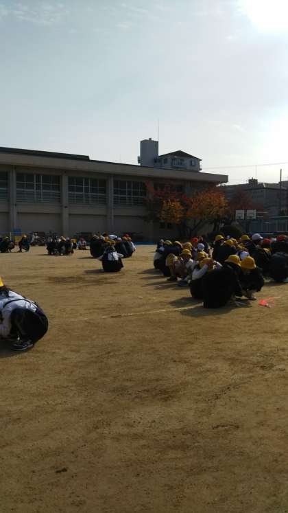 今日は、休み時間に地震が起こったという想定で避難訓練を行いました。運動場で遊んでいる子どもたちも多く、まずはその場でしゃがんで体を低くし、