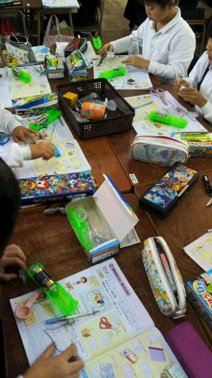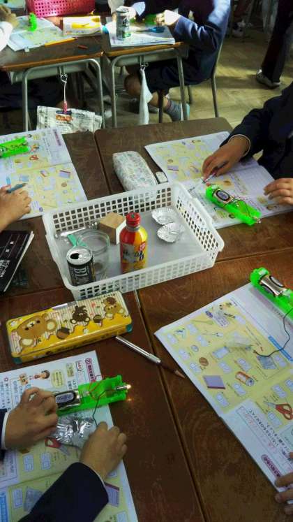 3年生は、理科「電気であかりをつけよう」の学習です。電気を通すものをグループでさがしました。