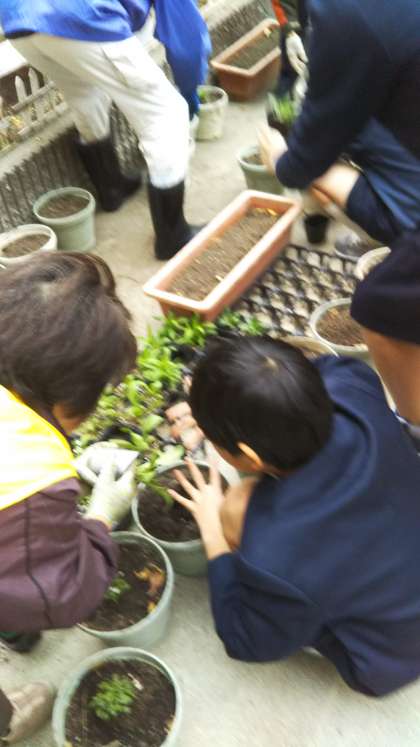 花さかすみちゃんのボランティアの方々と一緒にキンセンカ、ビオラ、ナデシコ、アリッサムの苗を植えました。この苗は、ボランティアの方々が種まきをして大事に育ててこられたものです。