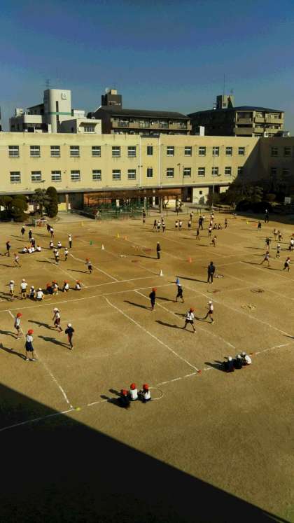 2年生が運動場いっぱに広がって「たから運びおに」をしています。腰に付けたタグをおにに取られないように宝を取りに走ります。チームワークよくおにの間をすり抜けています。
