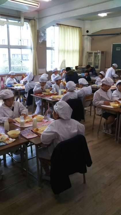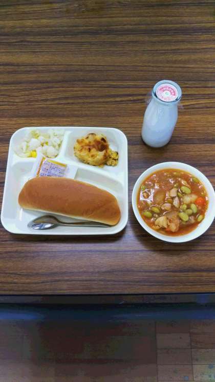 3学期初めの給食は、鶏肉と野菜のケチャップ煮、カリフラワーとコーンのサラダ、桃のグラフティ、コッペパン、アプリコットジャム、牛乳です。おいしく。もりもりいただきました。