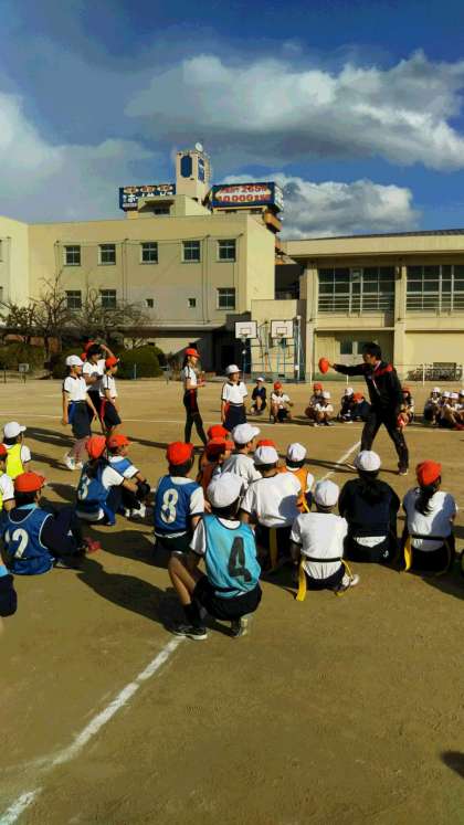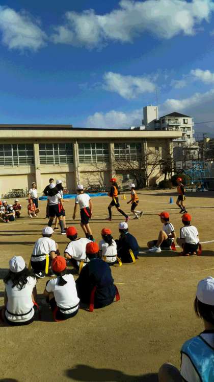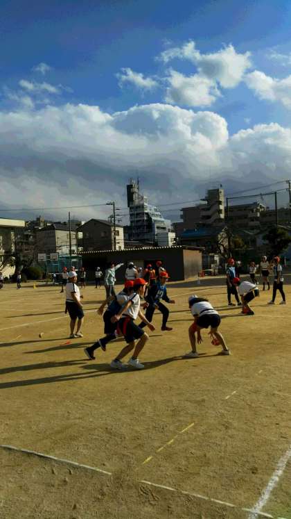 6年生が「フラッグフットボール」をしています。腰に付けたフラッグを相手に取られる前にチームでボールゴールまで運びます。