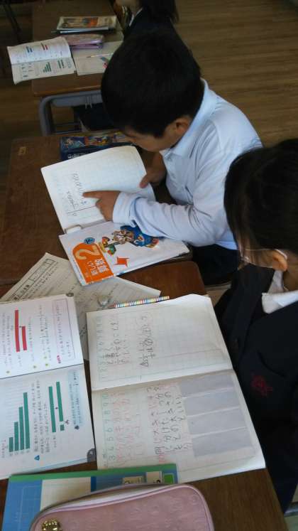 「分けた大きさのあらわし方をしらべよう」の単元で、分数でのあらわし方の学習をしています。意味とその便利さ、表記の仕方など、しっかり理解していきます。