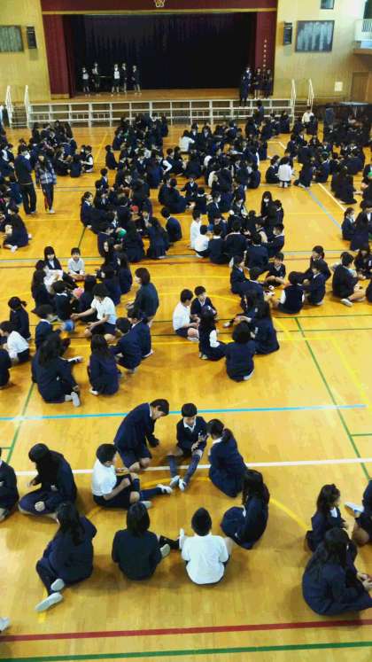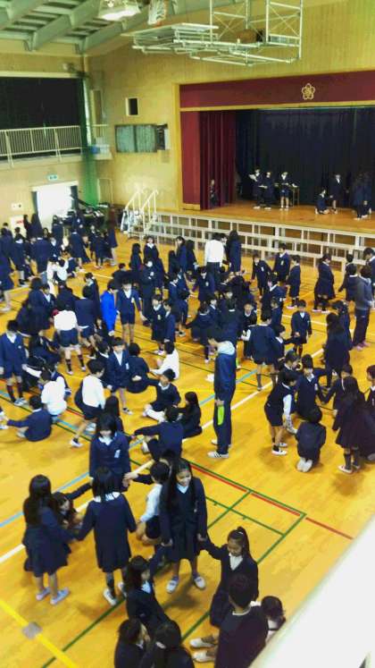 土曜授業で、卒業お祝い集会を行いました。まずは、縦割り班で集会委員会による3つのゲーム「バリチッチゲーム」「サウンドゲーム」「ふれあい おあいこ じゃんけん」で楽しみました。