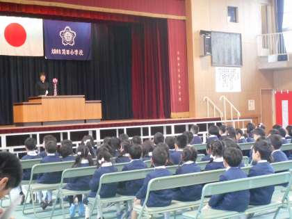 校長先生のお祝いの言葉に、「ありがとうございます。」「おはようございます。」「大丈夫?」「はい!」ときちんと返事ができるとてもしっかりした104名の元気な新入生です。来賓の皆様お一人お一人にも「ありがとうございます。」とお礼をいうことができました。