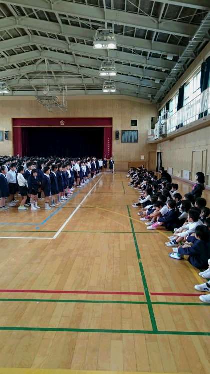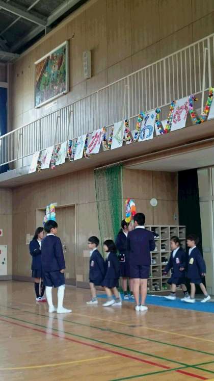 新学期が始まって4日め、1年生を迎える会を開きました。代表委員会の児童が司会進行を務め、歓迎の言葉やクイズをました。2年生から6年生が「世界がひとつになるまで」を合唱しました。心がこもった素敵なハーモニーが1年生に届き温かな会となりました。