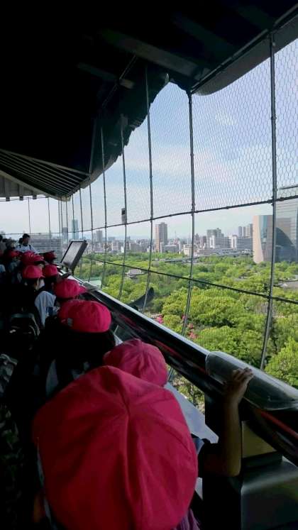 今日は朝から良い天気になり空も快晴です。3年は大阪城公園に着いて、天守閣に昇りました。観光客が多く階段が狭く大変でしたが、とても景色が良く見えて大喜びでした。