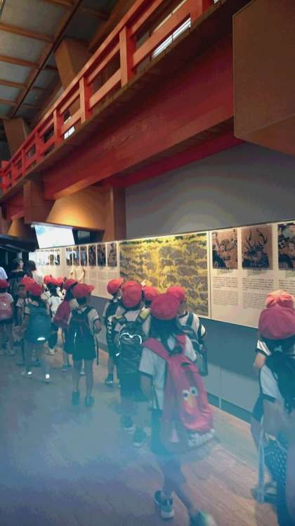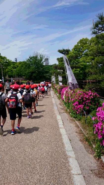 天守閣では大阪城の歴史や鎧兜などの展示を観ながら1階づつ階段を降りました。外国からの観光客が大勢いて、子どもたちは愛想が良いので大人気でした。城内では、今つつじが満開で青空に映えています。