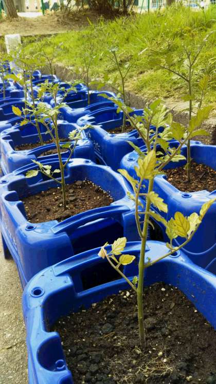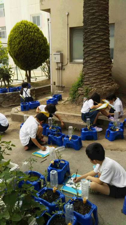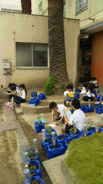 ミニトマトの観察をしました。苗を植えた時より大きくなったかな?葉っぱの数は増えたかな?