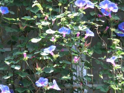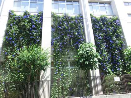 南校舎・西校舎の壁面に琉球朝顔(オーシャンブルー)が咲いています。教室内が少しでも涼しくなってくれたらと思います。