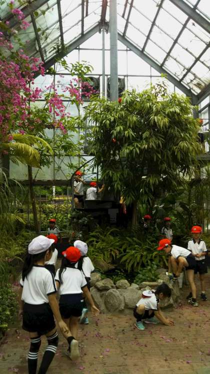 温室の中は、ブーゲンビリアのピンクのほうがたくさん落ちています。