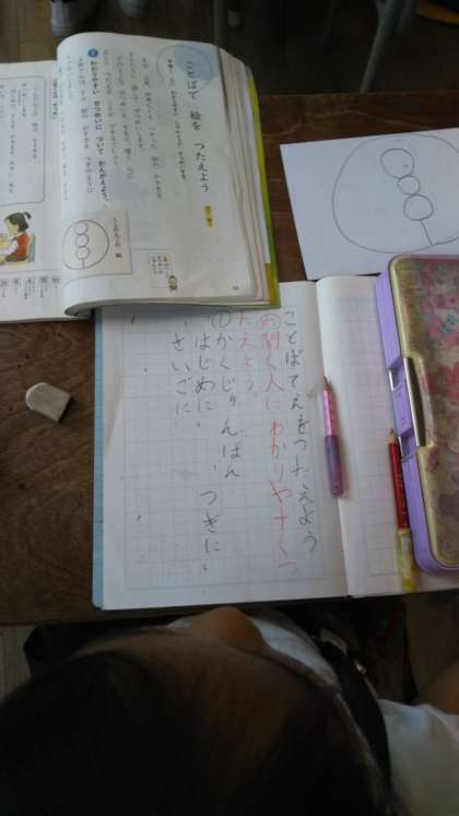 「ことばでえをつたえよう」の学習です。聞く人にわかりやすくつたえるには、どんなことを言えばいいか考えました。