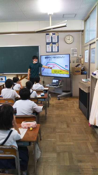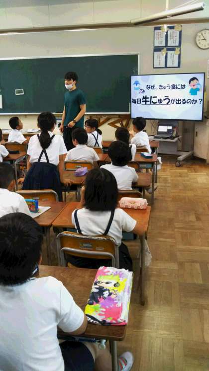 今年度初めての栄養教室で、栄養教諭の本多先生から食育の授業を受けました。「なぜ、給食に毎日牛乳が出るのか」をテーマにして、牛乳に含まれているカルシウムが骨や歯などを作ることやカルシウムのはたらきを学びました。牛乳やコーラにどれだけカルシウムが含まれているかを骨の絵を描いた帯状の紙の長さを比べて見て、牛乳のすごさを知ることができました。また、牛乳以外でもカルシウムをとるには、どんな食物を食べたら良いのかなど問題が出され、みんな真剣に考え答えていました。海藻類やしめじ、こまつな、チンゲンサイ、だいこんの葉など給食にでる野菜にも含まれていることを知りました。
