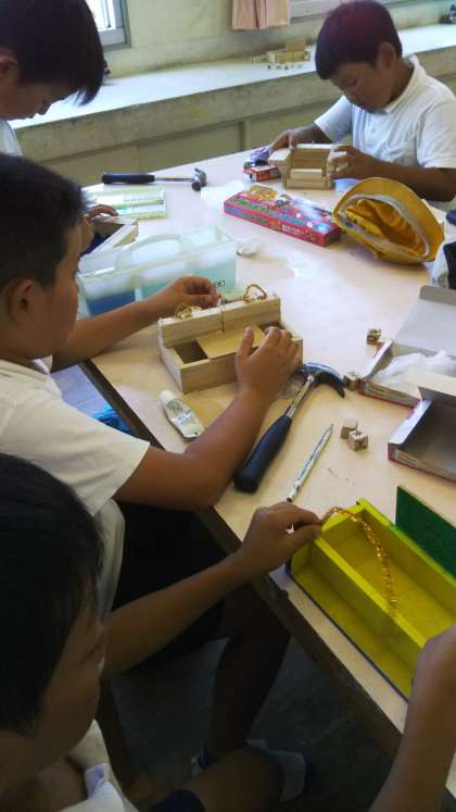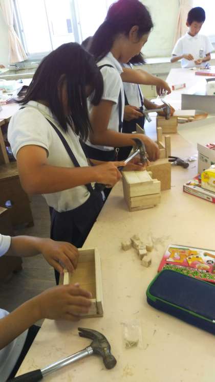 「ギコギコクリエイター」の教材で木切れをのこぎりで切ったり、釘を金づちで打って組み立てたりして、使うものや飾るものを作りました。
