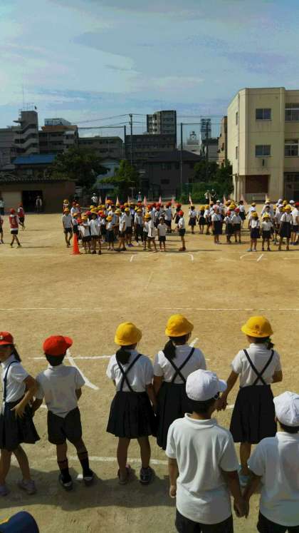 今日は、運動場で「ももたろう」をしました。さる、きじ、いぬに別れて、名前を呼ばれたチームが移動します。ももたろうで全員移動です。暑い中でしたが、元気に活動しました。