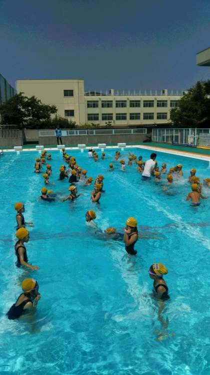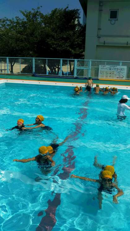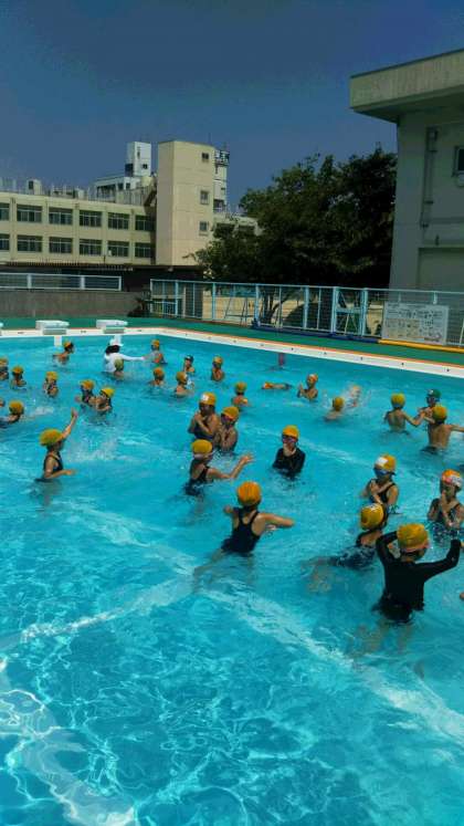 暑い暑い毎日が続いています。2年生は、1学期最後のプール水泳です。水をかけ合ったり、潜ったり、楽しく活動しました。