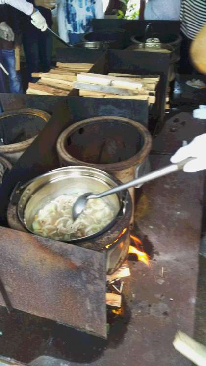 霧もだんだん晴れ天気も回復してきました。野菜を切ったり、火を起こしたり、煮込んだり、各々の役割を果たしました。さて、お味のほどは?