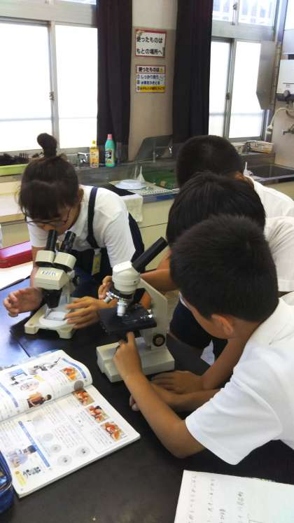 双眼実体顕微鏡で、ゴーヤの花粉を観察しました。初めて使う器具なので使い方をしっかり学習し、慎重にピントを合わせています。