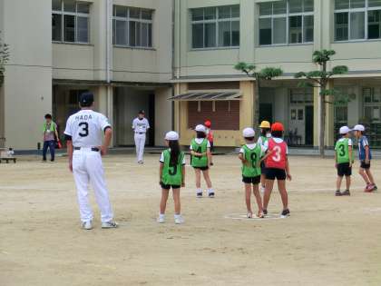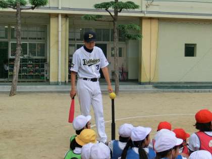 7月8日(火)1・2限 オリックス・バファローズの4人のコーチが学校訪問して、子どもたちにティボールの指導をしていただきました。羽田 耕一コーチ、大久保 勝信コーチ、乾 絵美コーチ、小澤 聡コーチ、現役の時は、とても有名な選手、トーレーニングコーチをされていました。子どもたちにとって、とてもすばらしい経験と思いました。