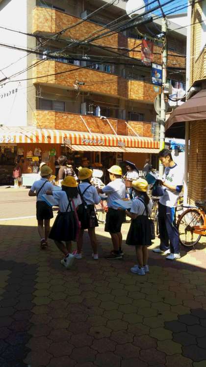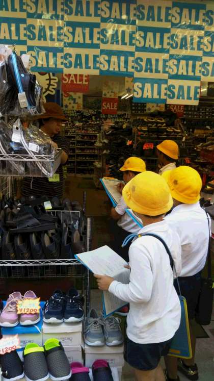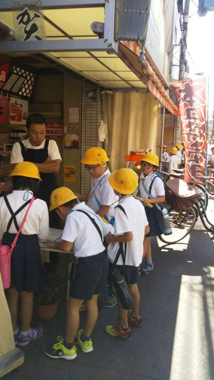 「店で働く人と仕事」の学習で、商店街とスーパーやコンビニとの違いを見つけようと商店街の探検をしました。