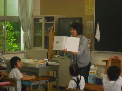 としょっぴぃで活動してくださっている方が、ぐんぐんタイムに1年生の教室で『しゅくだい』を読んでくださいました。