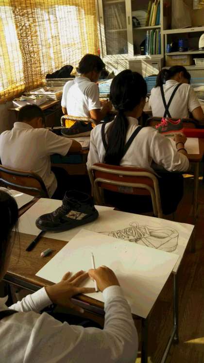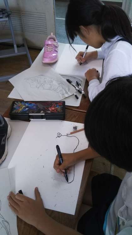 「わたしのくつ」自分のくつをしっかりみながら、ペンで描きました。練習はしましたが、鉛筆で下絵をかかず、慎重にゆっくり線を引いていきました。