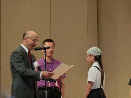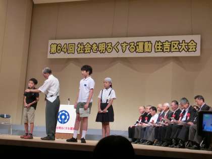 7月14日(月)住吉区民センター 大ホールで第64回社会を明るくする運動 小学生社明標語コンクール住吉区大会で6年生の竹本理子さんが優秀賞を受賞 「あいさつは 心を動かす 第一歩」たくさんの応募の中から選ばれました。これからもがんばってください。