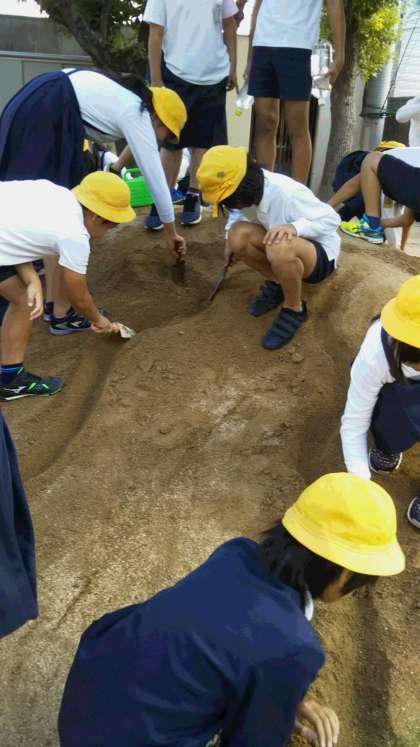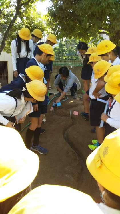 「流れる水のはたらき」の学習で、土山に川のモデルを作って水を流して観察します。川のカーブの内側と外側の様子を旗を立て観察しました。